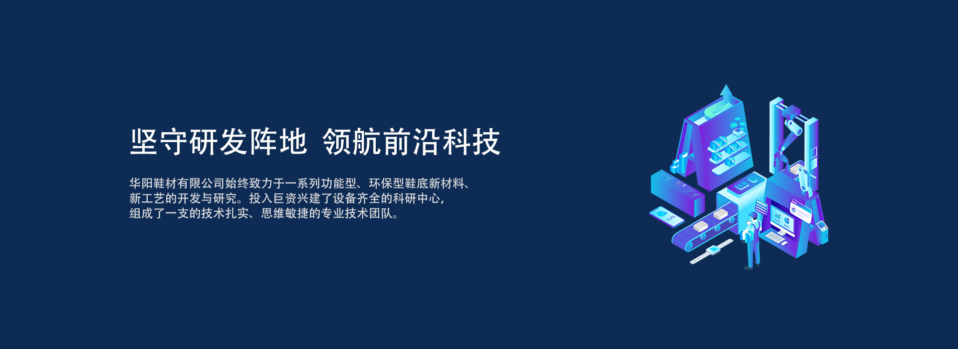 華陽鞋材有限公司始終致力于一系列功能型、環(huán)保型鞋底新材料、新工藝的開發(fā)與研究。投入巨資興建了設(shè)備齊全的科研中心,組成了一支的技術(shù)扎實、思維敏捷的專業(yè)技術(shù)團隊。全球領(lǐng)先的材料科學(xué)分析儀器和檢測設(shè)備,形成了從材料研發(fā)、新品開發(fā)、實驗測試、技術(shù)轉(zhuǎn)移到規(guī)模生產(chǎn)的一體化作業(yè)流程,為產(chǎn)品的生產(chǎn)提供了有力的品質(zhì)保障。